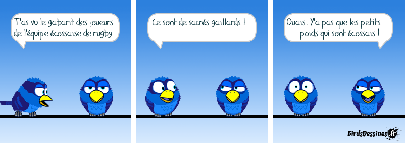 Case 1:Bird 1: T'as vu le gabarit des joueurs de l'équipe écossaise de rugby Case 2:Bird 1: Ce sont de sacrés gaillards ! Case 3:Bird 1: Ouais. Y'a pas que les petits poids qui sont écossais !