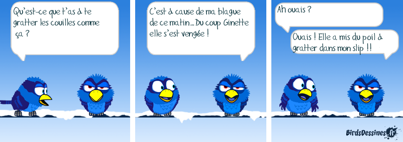 Case 1:Bird 1: Qu’est-ce que t’as à te gratter les couilles comme ça ? Case 2:Bird 1: C’est à cause de ma blague de ce matin…Du coup Ginette elle s’est vengée ! Case 3:Bird 1: Ah ouais ?Bird 2: Ouais ! Elle a mis du poil à gratter dans mon slip !!