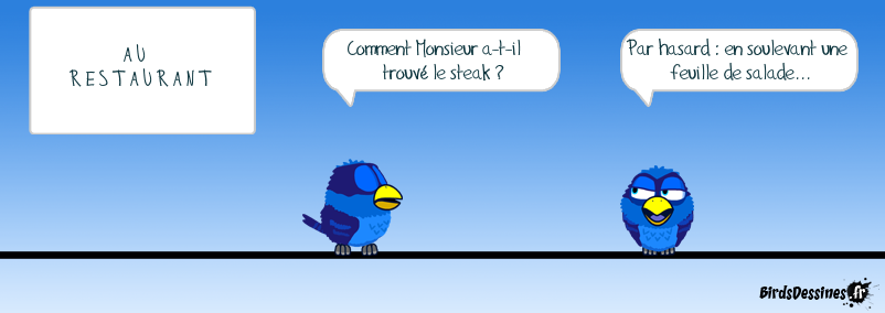Case 1:Bird 1: A U R E S T A U R A N T Case 2:Bird 1: Comment Monsieur a-t-il trouvé le steak ? Case 3:Bird 1: Par hasard : en soulevant une feuille de salade...