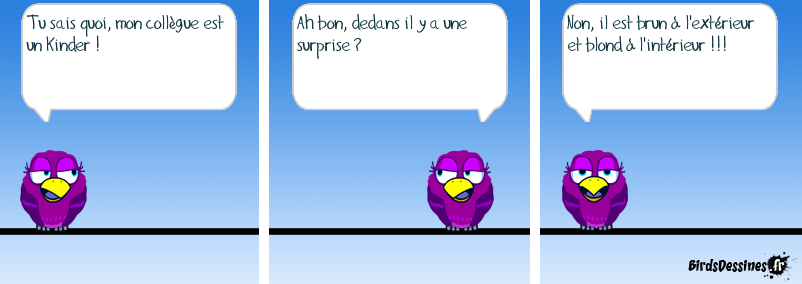Case 1:Bird 1: Tu sais quoi, mon collègue est un Kinder ! Case 2:Bird 1: Ah bon, dedans il y a une surprise ? Case 3:Bird 1: Non, il est brun à l'extérieur et blond à l'intérieur !!!