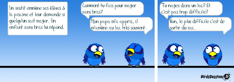 Case 1:Bird 1: Un instit emmène ses élèves à la piscine et leur demande si quelqu'un sait nager. Un enfant sans bras lui répond. Case 2:Bird 1: Comment tu fais pour nager sans bras? Bird 2: Mon papa m'a appris, il m'amène au lac très souvent. Case 3:Bird 1: Tu nages dans un lac? Et c'est pas trop difficile?Bird 2: Non, le plus difficile c'est de sortir du sac.