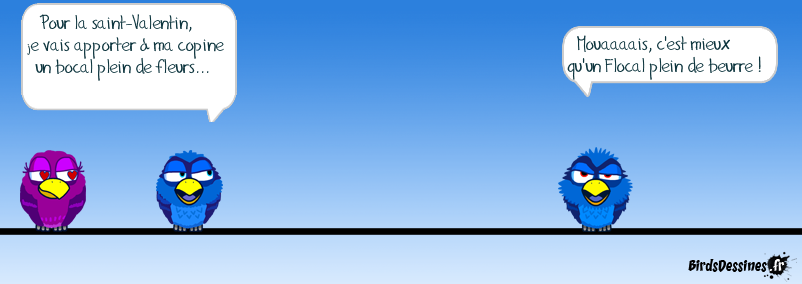 Case 1:Bird 1: Pour la saint-Valentin, je vais apporter à ma copine un bocal plein de fleurs... Case 2: Case 3:Bird 1: Mouaaaais, c'est mieux qu'un Flocal plein de beurre !