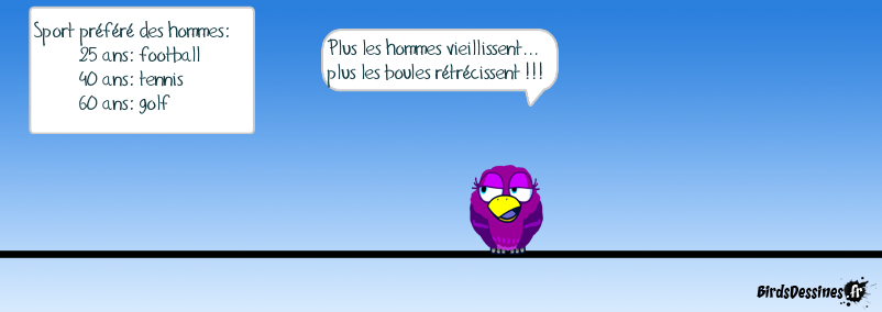 Case 1:Bird 1: Sport préféré des hommes: 25 ans: football 40 ans: tennis 60 ans: golf Case 2:Bird 1: Plus les hommes vieillissent... plus les boules rétrécissent !!! Case 3: