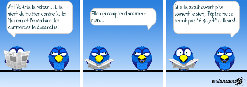 Case 1:Bird 1: Ah! Valérie le retour... Elle vient de twitter contre la loi Macron et l'ouverture des commerces le dimanche. Case 2:Bird 1: Elle n'y comprend vraiment rien... Case 3:Bird 1: Si elle avait ouvert plus souvent le sien, Pépère ne se serait pas "é-gayet" ailleurs!