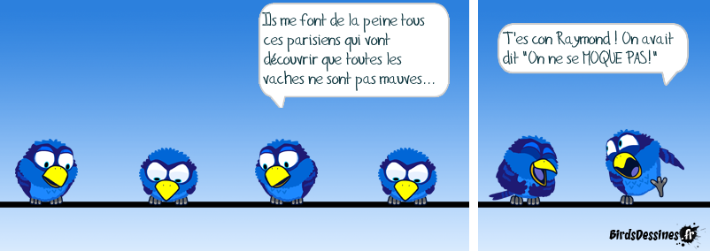 Case 1: Case 2:Bird 1: Ils me font de la peine tous ces parisiens qui vont découvrir que toutes les vaches ne sont pas mauves... Case 3:Bird 1: T'es con Raymond ! On avait dit "On ne se MOQUE PAS!"