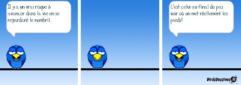 Case 1:Bird 1: Il y a un vrai risque à avancer dans la vie en se regardant le nombril. Case 2: Case 3:Bird 1: C'est celui au final de pas voir où on met réellement les pieds!