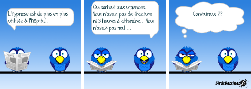 Case 1:Bird 1: L'hypnose est de plus en plus utilisée à l'hôpital. Case 2:Bird 1: Oui surtout aux urgences. Vous n'avez pas de fracture ni 3 heures à attendre... Vous n'avez pas mal ... Case 3:Bird 1: Convaincus ??