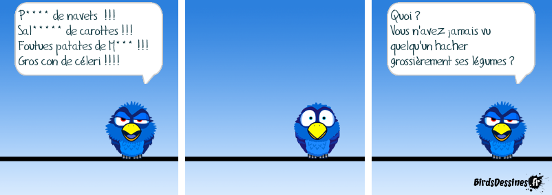 Case 1:Bird 1: P**** de navets !!! Sal***** de carottes !!! Foutues patates de M*** !!! Gros con de céleri !!!! Case 2: Case 3:Bird 1: Quoi ? Vous n'avez jamais vu quelqu'un hacher grossièrement ses légumes ?