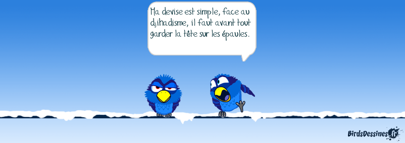 Case 1: Case 2:Bird 1: Ma devise est simple, face au djihadisme, il faut avant tout garder la tête sur les épaules. Case 3: