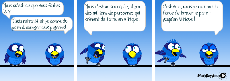 Case 1:Bird 1: Mais qu'est-ce que vous faites là ?Bird 2: J'suis retraité et je donne du pain à manger aux pigeons! Case 2:Bird 1: Mais c'est un scandale, il y a des millions de personnes qui crèvent de faim, en Afrique ! Case 3:Bird 1: C'est vrai, mais je n'ai pas la force de lancer le pain jusqu'en Afrique !