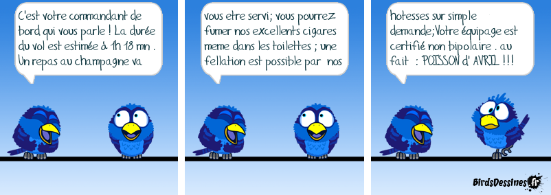 Case 1:Bird 1: C'est votre commandant de bord qui vous parle ! La durée du vol est estimée à 1h 18 mn . Un repas au champagne va Case 2:Bird 1: vous etre servi; vous pourrez fumer nos excellents cigares meme dans les toilettes ; une fellation est possible par nos Case 3:Bird 1: hotesses sur simple demande;Votre équipage est certifié non bipolaire . au fait : POISSON d' AVRIL !!!