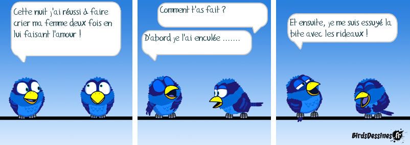 Case 1:Bird 1: Cette nuit j'ai réussi à faire crier ma femme deux fois en lui faisant l'amour ! Case 2:Bird 1: Comment t'as fait ? Bird 2: D'abord je l'ai enculée ....... Case 3:Bird 1: Et ensuite, je me suis essuyé la bite avec les rideaux !