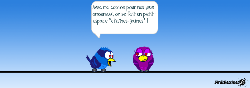 Case 1: Case 2:Bird 1: Avec ma copine pour nos jeux amoureux, on se fait un petit espace "chaïnes-gaines" ! Case 3: