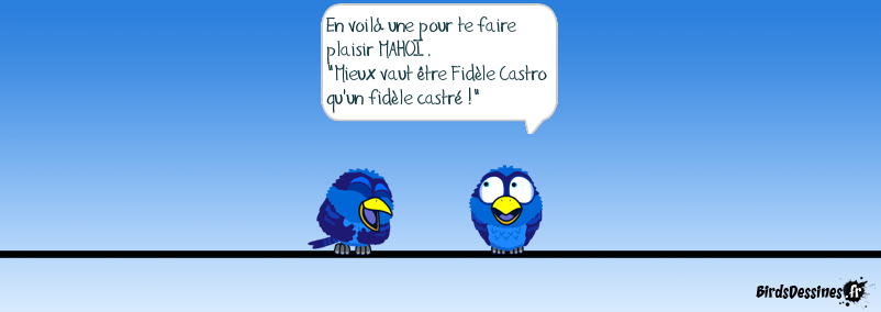 Case 1: Case 2:Bird 1: En voilà une pour te faire plaisir MAHOI . "Mieux vaut être Fidèle Castro qu'un fidèle castré !" Case 3: