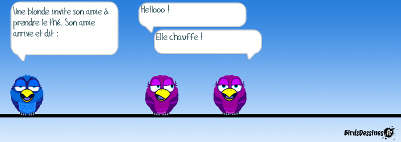 Case 1:Bird 1: Une blonde invite son amie à prendre le thé. Son amie arrive et dit : Case 2:Bird 1: Hellooo !Bird 2: Elle chauffe ! Case 3: