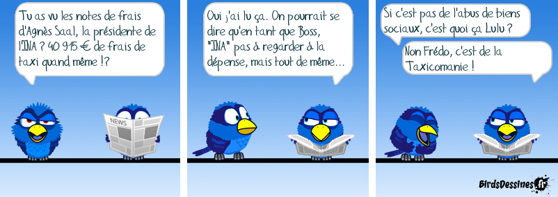 Case 1:Bird 1: Tu as vu les notes de frais d'Agnès Saal, la présidente de l'INA ? 40 915 € de frais de taxi quand même !? Case 2:Bird 1: Oui j'ai lu ça. On pourrait se dire qu'en tant que Boss, "INA" pas à regarder à la dépense, mais tout de même... Case 3:Bird 1: Si c'est pas de l'abus de biens sociaux, c'est quoi ça Lulu ?Bird 2: Non Frédo, c'est de la Taxicomanie !