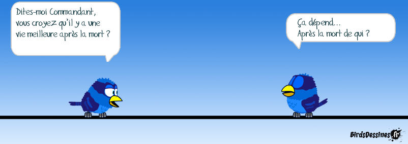 Case 1:Bird 1: Dites-moi Commandant, vous croyez qu’il y a une vie meilleure après la mort ? Case 2: Case 3:Bird 1: Ça dépend... Après la mort de qui ?