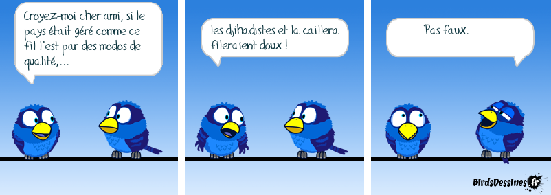 Case 1:Bird 1: Croyez-moi cher ami, si le pays était géré comme ce fil l’est par des modos de qualité,... Case 2:Bird 1: les djihadistes et la caillera fileraient doux ! Case 3:Bird 1: Pas faux.