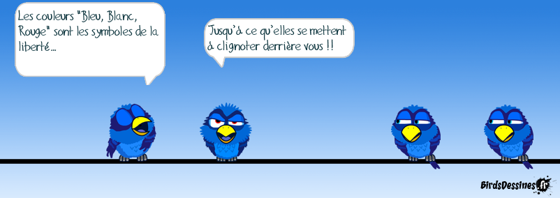 Case 1:Bird 1: Les couleurs "Bleu, Blanc, Rouge" sont les symboles de la liberté… Case 2:Bird 1: Jusqu’à ce qu’elles se mettent à clignoter derrière vous !! Case 3: