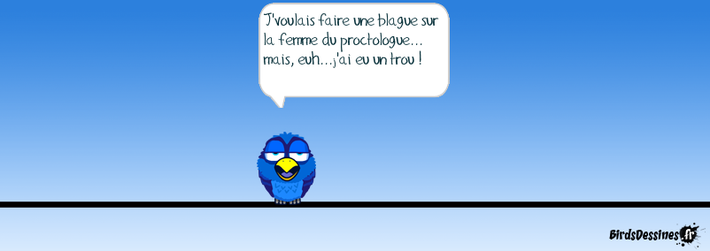 Case 1: Case 2:Bird 1: J'voulais faire une blague sur la femme du proctologue... mais, euh...j'ai eu un trou ! Case 3: