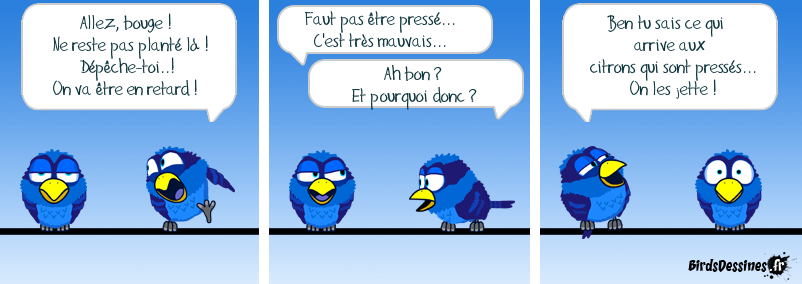 Case 1:Bird 1: Allez, bouge ! Ne reste pas planté là ! Dépêche-toi..! On va être en retard ! Case 2:Bird 1: Faut pas être pressé... C'est très mauvais...Bird 2: Ah bon ? Et pourquoi donc ? Case 3:Bird 1: Ben tu sais ce qui arrive aux citrons qui sont pressés... On les jette !