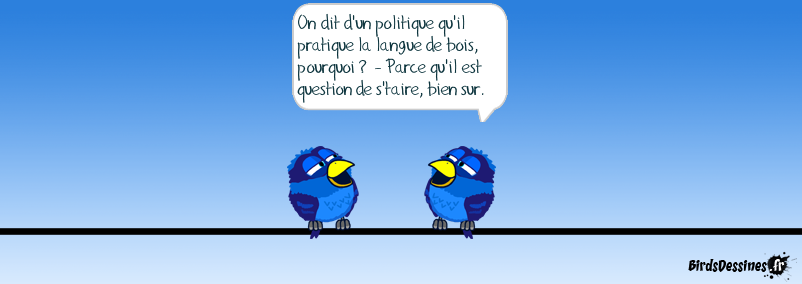 Case 1: Case 2:Bird 1: On dit d'un politique qu'il pratique la langue de bois, pourquoi ? - Parce qu'il est question de s'taire, bien sur. Case 3: