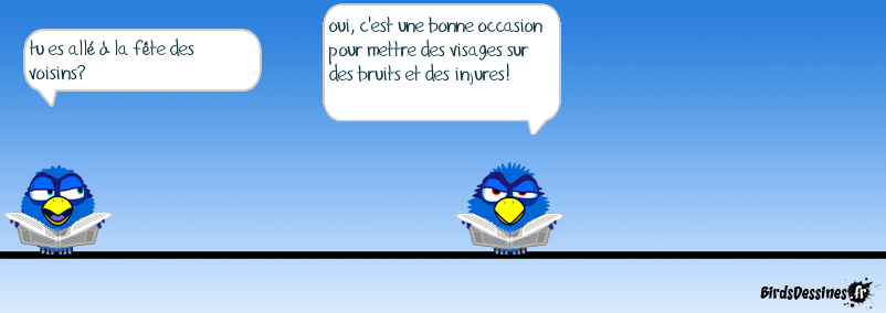Case 1:Bird 1: tu es allé à la fête des voisins? Case 2:Bird 1: oui, c'est une bonne occasion pour mettre des visages sur des bruits et des injures! Case 3: