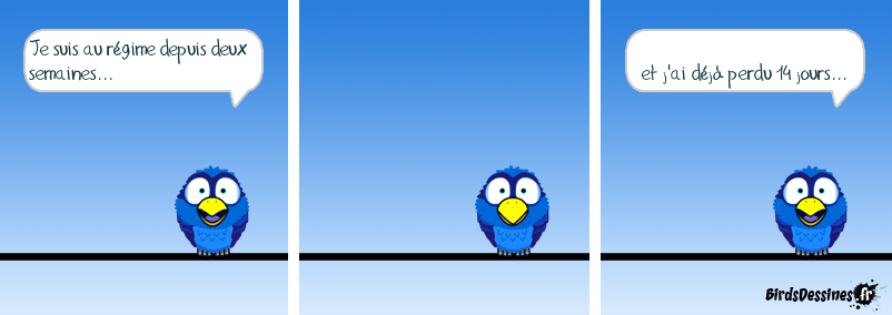Case 1:Bird 1: Je suis au régime depuis deux semaines... Case 2: Case 3:Bird 1: et j'ai déjà perdu 14 jours...