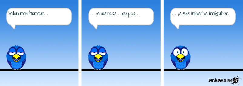 Case 1:Bird 1: Selon mon humeur... Case 2:Bird 1: ... je me rase... ou pas... Case 3:Bird 1: ... je suis imberbe irrégulier.
