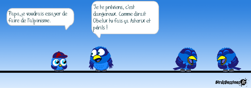 Case 1:Bird 1: Papa,je voudrais essayer de faire de l'alpinisme. Case 2:Bird 1: Je te préviens, c'est dangereux. Comme dirait Obelix tu fais ça Asterix et périls ! Case 3: