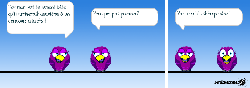 Case 1:Bird 1: Mon mari est tellement bête qu'il arriverait deuxième à un concours d'idiots ! Case 2:Bird 1: Pourquoi pas premier? Case 3:Bird 1: Parce qu'il est trop bête !