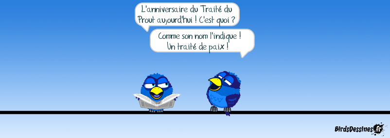 Case 1: Case 2:Bird 1: L'anniversaire du Traité du Prout aujourd'hui ! C'est quoi ?Bird 2: Comme son nom l'indique ! Un traité de paix ! Case 3: