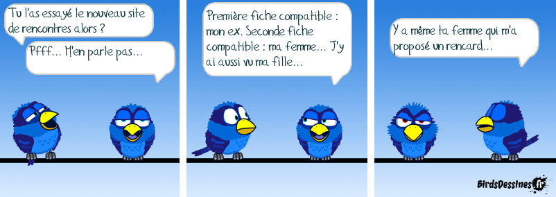 Case 1:Bird 1: Tu l'as essayé le nouveau site de rencontres alors ?Bird 2: Pfff... M'en parle pas... Case 2:Bird 1: Première fiche compatible : mon ex. Seconde fiche compatible : ma femme... J'y ai aussi vu ma fille... Case 3:Bird 1: Y a même ta femme qui m'a proposé un rencard...