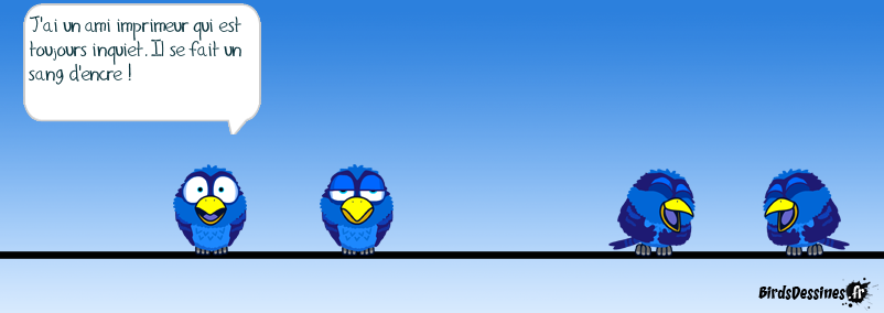 Case 1:Bird 1: J'ai un ami imprimeur qui est toujours inquiet. Il se fait un sang d'encre ! Case 2: Case 3: