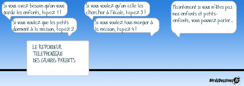 Case 1:Bird 1: Si vous avez besoin qu'on vous garde les enfants, tapez 1 !Bird 2: Si vous voulez que les petits dorment à la maison, tapez 2 Case 2:Bird 1: Si vous voulez qu’on aille les chercher à l’école, tapez 3 !Bird 2: Si vous voulez tous manger à la maison, tapez 4 ! Case 3:Bird 1: Maintenant si vous n’êtes pas nos enfants et petits-enfants, vous pouvez parler…