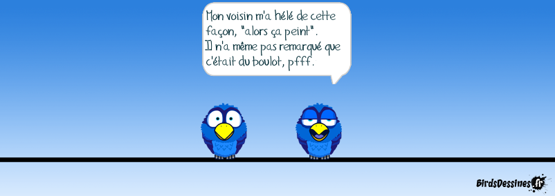 Case 1: Case 2:Bird 1: Mon voisin m'a hélé de cette façon, "alors ça peint". Il n'a même pas remarqué que c'était du boulot, pfff. Case 3: