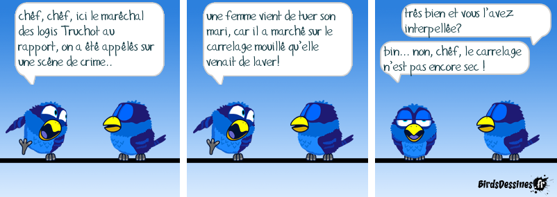 Case 1:Bird 1: chêf, chêf, ici le marêchal des logis Truchot au rapport, on a êtê appêlês sur une scêne de crime.. Case 2:Bird 1: une femme vient de tuer son mari, car il a marchê sur le carrelage mouillê qu’elle venait de laver! Case 3:Bird 1: três bien et vous l’avez interpellêe?Bird 2: bin... non, chêf, le carrelage n’est pas encore sec !