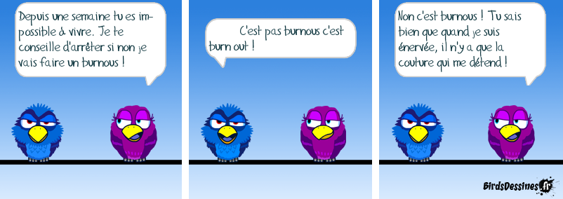 Case 1:Bird 1: Depuis une semaine tu es im-possible à vivre. Je te conseille d'arrêter si non je vais faire un burnous ! Case 2:Bird 1: C'est pas burnous c'est burn out ! Case 3:Bird 1: Non c'est burnous ! Tu sais bien que quand je suis énervée, il n'y a que la couture qui me détend !