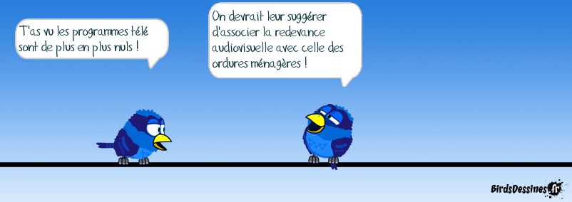 Case 1:Bird 1: T'as vu les programmes télé sont de plus en plus nuls ! Case 2:Bird 1: On devrait leur suggérer d'associer la redevance audiovisuelle avec celle des ordures ménagères ! Case 3: