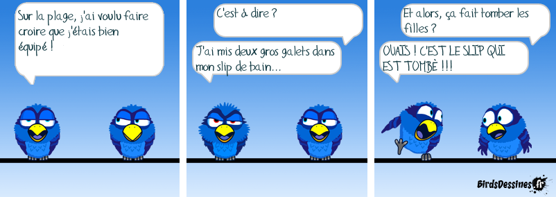 Case 1:Bird 1: Sur la plage, j'ai voulu faire croire que j'étais bien équipé ! Case 2:Bird 1: C'est à dire ? Bird 2: J'ai mis deux gros galets dans mon slip de bain... Case 3:Bird 1: Et alors, ça fait tomber les filles ?Bird 2: OUAIS ! C'EST LE SLIP QUI EST TOMBÉ !!!