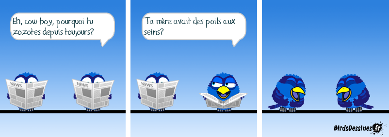 Case 1:Bird 1: Eh, cow-boy, pourquoi tu zozotes depuis toujours? Case 2:Bird 1: Ta mère avait des poils aux seins? Case 3: