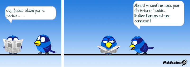 Case 1:Bird 1: Guy Bedos relaxé par la justice ...... Case 2: Case 3:Bird 1: Alors il se confirme que, pour Christiane Taubira Nadine Morano est une connasse !