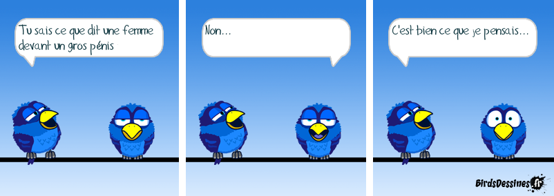 Case 1:Bird 1: Tu sais ce que dit une femme devant un gros pénis Case 2:Bird 1: Non... Case 3:Bird 1: C'est bien ce que je pensais...