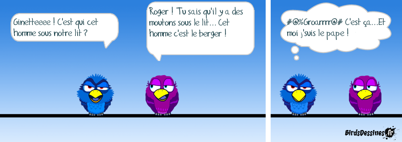 Case 1:Bird 1: Ginetteeee ! C'est qui cet homme sous notre lit ? Case 2:Bird 1: Roger ! Tu sais qu'il y a des moutons sous le lit... Cet homme c'est le berger ! Case 3:Bird 1: #@%Groarrrr@# C'est ça...Et moi j'suis le pape !