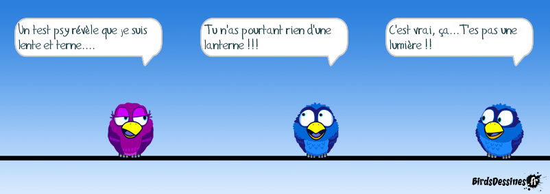 Case 1:Bird 1: Un test psy révèle que je suis lente et terne.... Case 2:Bird 1: Tu n'as pourtant rien d'une lanterne !!! Case 3:Bird 1: C'est vrai, ça...T'es pas une lumière !!