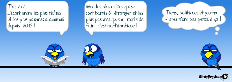 Case 1:Bird 1: T'as vu ? L'écart entre les plus riches et les plus pauvres a diminué depuis 2012 ! Case 2:Bird 1: Avec les plus riches qui se sont barrés à l'étranger et les plus pauvres qui sont morts de faim, c'est mathématique ! Case 3:Bird 1: Tiens, politiques et journa- -listes n'ont pas pensé à ça !