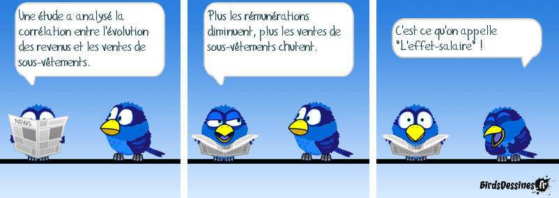 Case 1:Bird 1: Une étude a analysé la corrélation entre l'évolution des revenus et les ventes de sous-vêtements. Case 2:Bird 1: Plus les rémunérations diminuent, plus les ventes de sous-vêtements chutent. Case 3:Bird 1: C'est ce qu'on appelle "L'effet-salaire" !