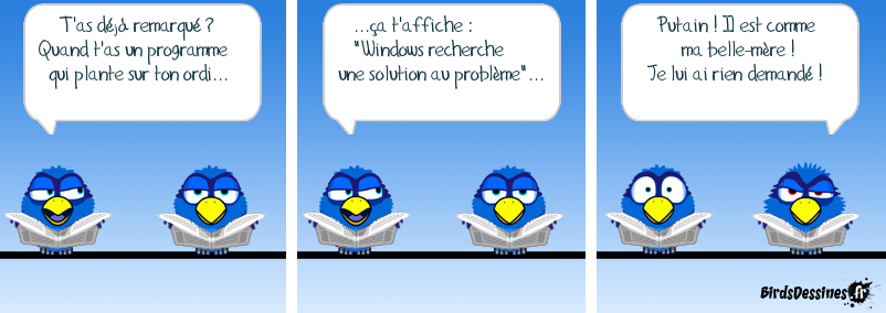 Case 1:Bird 1: T'as déjà remarqué ? Quand t'as un programme qui plante sur ton ordi... Case 2:Bird 1: ...ça t'affiche : "Windows recherche une solution au problème"... Case 3:Bird 1: Putain ! Il est comme ma belle-mère ! Je lui ai rien demandé !