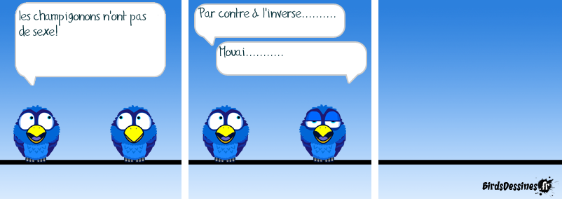 Case 1:Bird 1: les champigonons n'ont pas de sexe! Case 2:Bird 1: Par contre à l'inverse..........Bird 2: Mouai........... Case 3:
