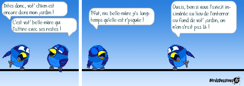 Case 1:Bird 1: Dites donc, vot' chien est encore dans mon jardin !Bird 2: C'est vot' belle-mère qui l'attire avec ses restes ! Case 2:Bird 1: Pfut, ma belle-mère y'a long-temps qu'elle est r'piquée ! Case 3:Bird 1: Ouais, ben si vous l'aviez in-cinérée au lieu de l'enterrer au fond de vot' jardin, on n'en s'rait pas là !